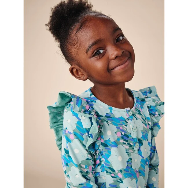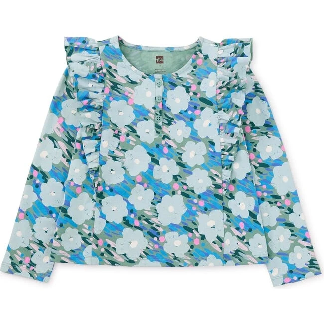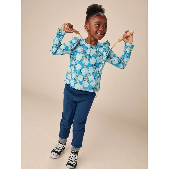 Inspired by Monet’s garden, we’ve put a French twist on the popular Ruffle Shoulder Henley. Imbued with so much lovely detailing, this top brings effortless style to any outfit. Whether paired with skirts, joggers, or pants, this top does double duty for everyday play and party dress-up. A soft blend of 95% cotton and 5% spandex for easy-fit wear. Functional center button placket. Low hip length.
