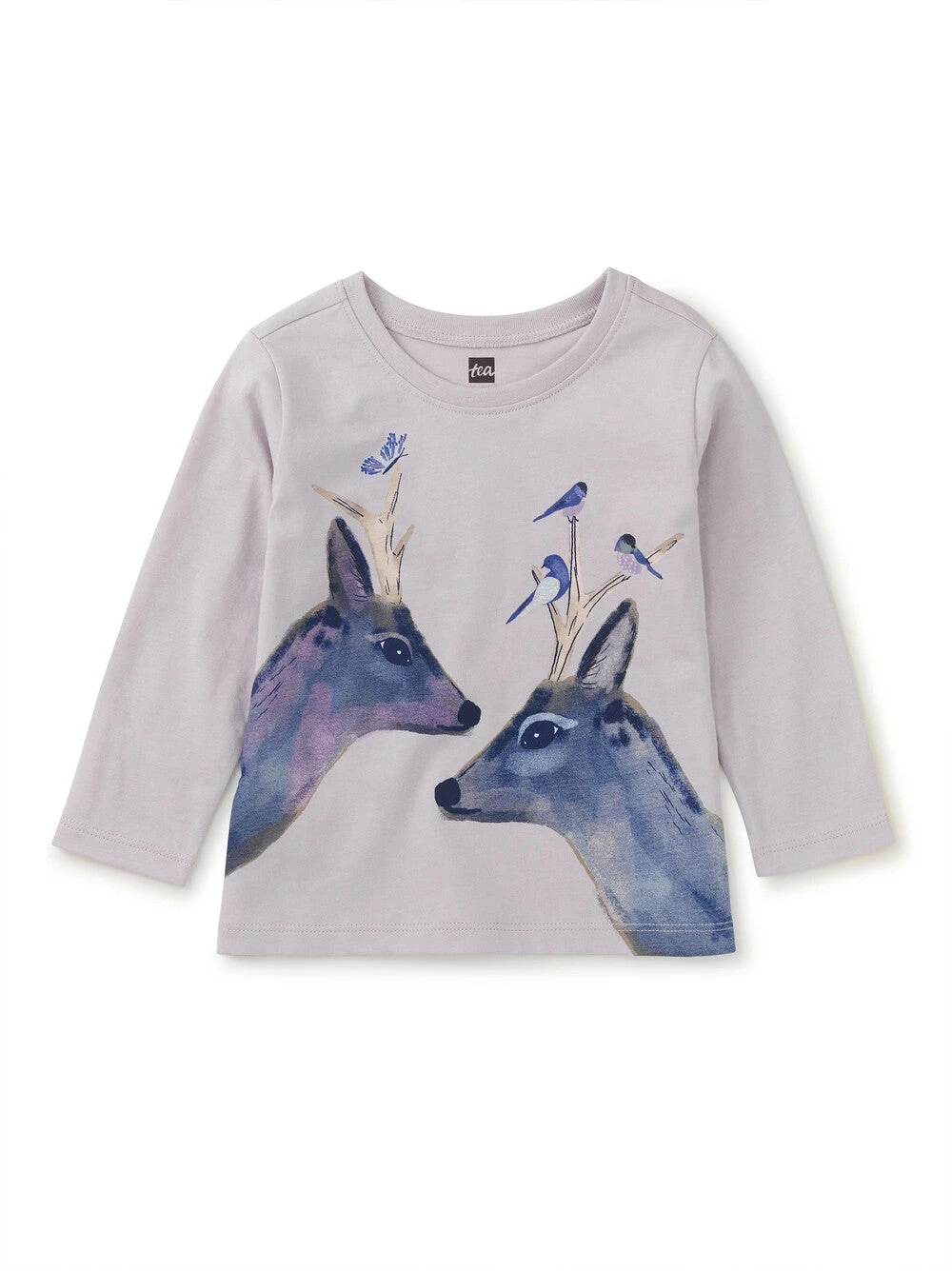 The winter-friendly long sleeve tee features an exclusive graphic of the best of friends in harmony: deer, birds and butterfly. Pair with skirts, joggers, or the favorite playwear jeggings. Made from 100% cotton jersey, that stays soft and durable, wash after wash.