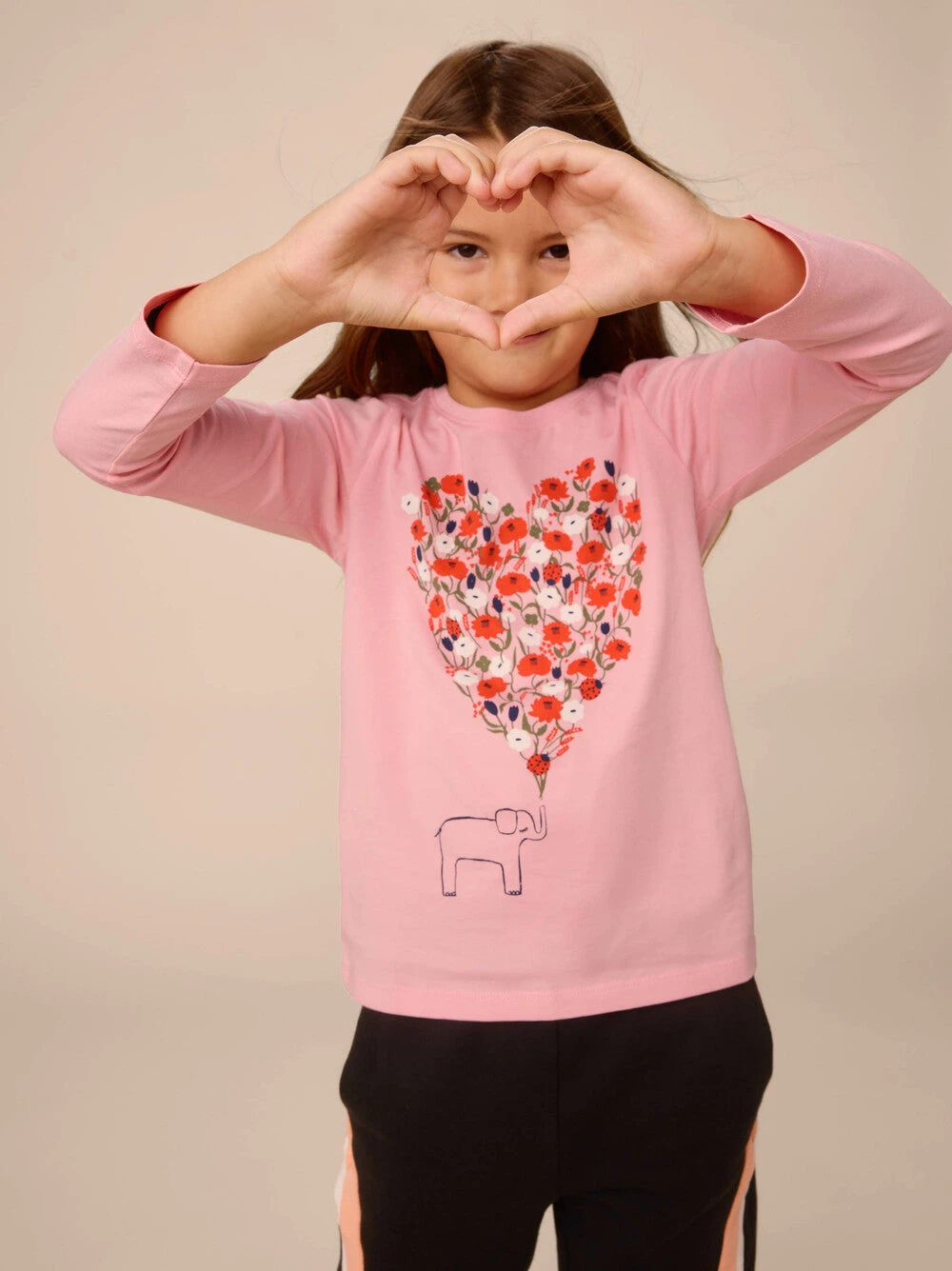 A lovable elephant sends a giant heart filled with flowers and ladybugs floating from its trunk, spreading joy and charm. Perfect for Valentines Day and beyond, this cozy long sleeve tee is made from 100% soft cotton jersey for everyday comfort. Pair with joggers for a look as sweet as the design. Above-thigh length.