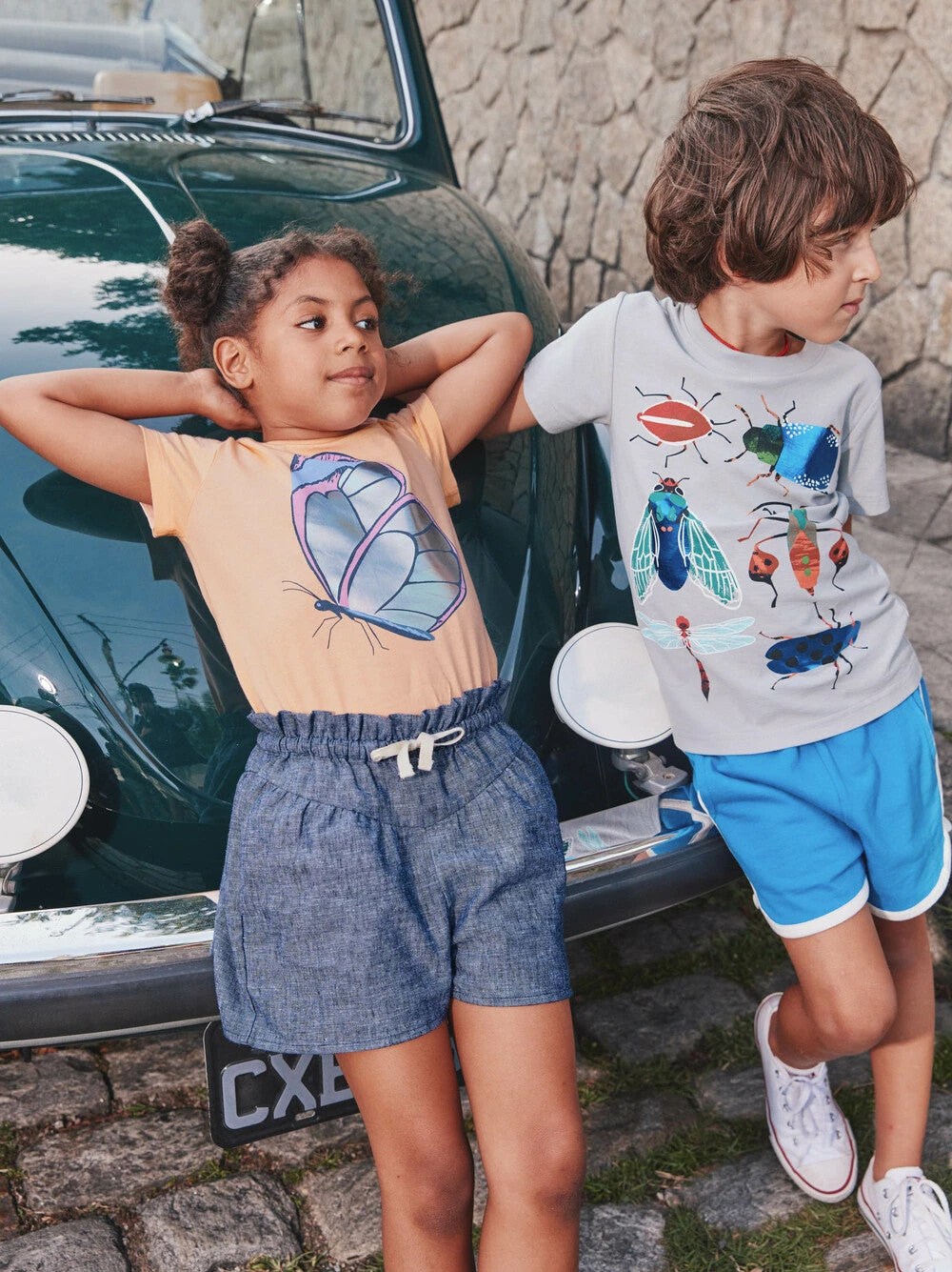 From dazzling wings to polka-dot shells, these bugs shine bright thanks to special metallic foil detailing. Inspired by Brazil’s rich insect life, this playful print is a colorful celebration of the tiniest adventurers in the rainforest. Crafted from 100% soft cotton jersey, this short-sleeve tee will retain its color and styling after every wear and wash. Interior neck tape adds lasting quality. Pair with Tea-favorite Playwear shorts. Above thigh length.